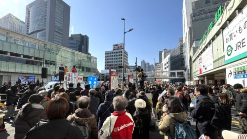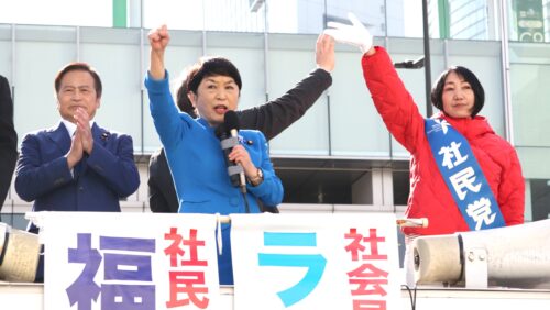 福島党首が新宿駅前で大椿ゆうこ東京比例候補と第一声 ~ 軍拡NO!税金は暮らしの支えに使って