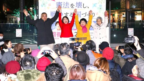 戦争への暴走政治を止める ~ 社民・共産・新社会の3党首が街宣