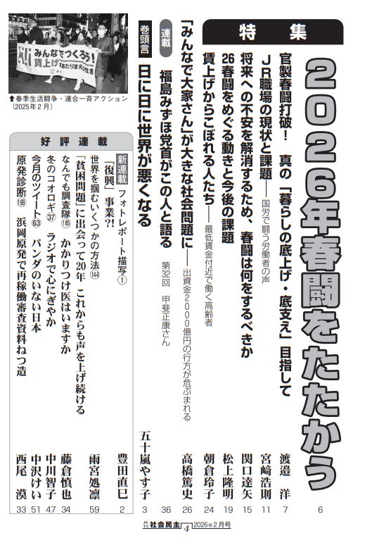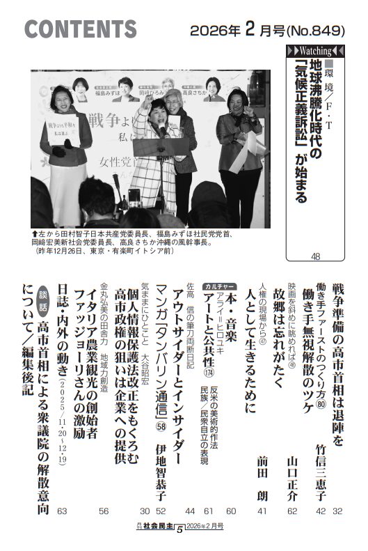 自民・維新連立の高市政権が2025年10月に発足以降、政治の右旋回が急激に進み.差別・排外主義と「戦争する国」づくりへの暴走が懸念される。「台湾有事」をめぐる首相発言で日中関係が最悪に陥り、経済不況に拍車をかけている。気候変動や円安、異常な物価高が勤労階層の生活を直撃している。