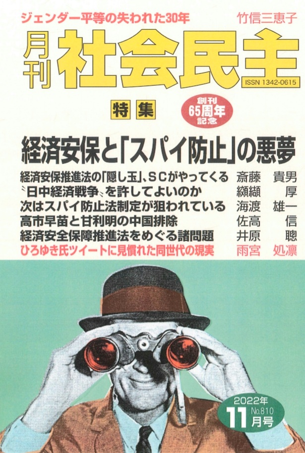 11月号の特集タイトルは「経済安保と『スパイ防止』の悪夢」。政府は経済安保法について来年の通常国会に改正案を出し、セキュリティ・クリアランス(適格性評価)を入れる。学術研究の軍事化と監視社会の到来。対中の米国覇権維持に日本が走狗と化す悪夢。発売は26日です。