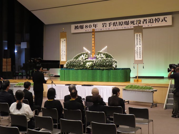 原爆死没者追悼式には100人が参加。達増拓也県知事と内館茂盛岡市長が、主催者として追悼の式辞を述べた。参加者の献花後には、第27代県高校生平和大使が「原爆の悲惨な光景と核兵器の非人道性を忘れてはならない。被爆者の平和への祈願を継承し、声を上げ続ける」と誓いを述べ、高校生合唱部が「長崎の鐘」などを熱唱した。