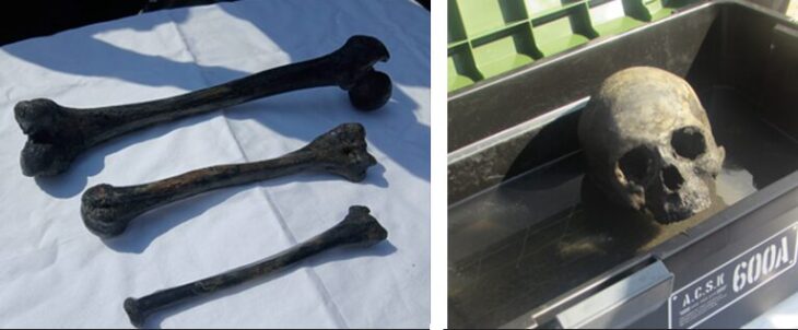 発見されたご遺骨。頭蓋骨(右)と大腿骨など。(刻む会提供)