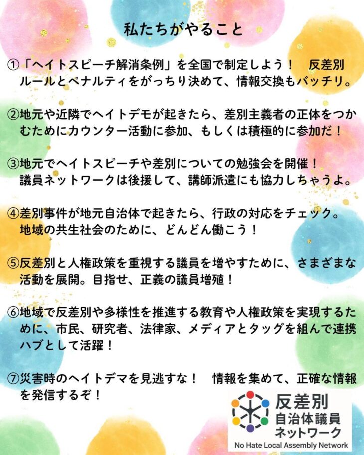 このネットワークがやるべきことを共有したまとめが、上記の「私たちがやるべきこと」である。継続的なヘイト現場の視察、地元議会でのヘイト取り締まりの提言などだ。