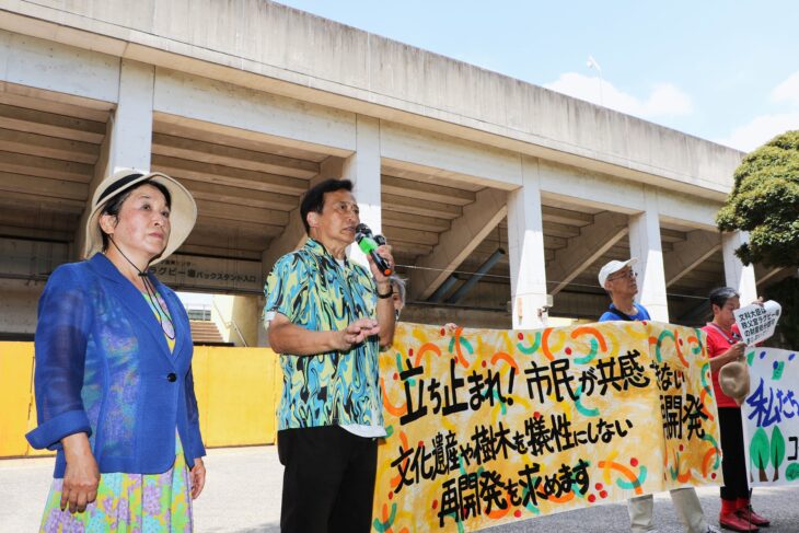 多くの樹木を伐採し超高層ビルを建設する明治神宮外苑再開発(東京都新宿区・港区)に対して、市民と超党派の議員が7月26日、秩父宮ラグビー場東門前で同ラグビー場用地の権利変換を認可しないよう文科相に求める緊急のスタンディングを展開した。