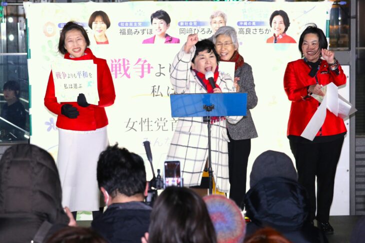 「戦争より平和を私は選ぶ」を合言葉に、社会民主党、日本共産党、新社会党、参院会派「沖縄の風」の4野党・会派の女性党首・幹事長が昨年12月26日の夕方、東京・有楽町イトシア前で街頭トークを行なった。大軍拡と排外主義の暴走を進める高市政権の退陣を訴えた。寒風が吹く中、約500人が参加した。社民党の五十嵐やす子板橋区議、共産党の米倉春奈都議が司会を務めた。