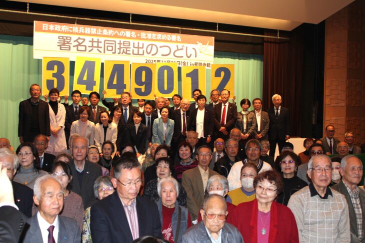 日本原水爆被害者団体協議会(被団協)は11月21日、東京・永田町で「日本政府は核兵器禁止条約への署名・批准を求める署名共同提出のつどい」を開催し、344万9012人分の署名を外務省に提出した。全国から被爆者など320人が参加し、会場は熱気に包まれた。