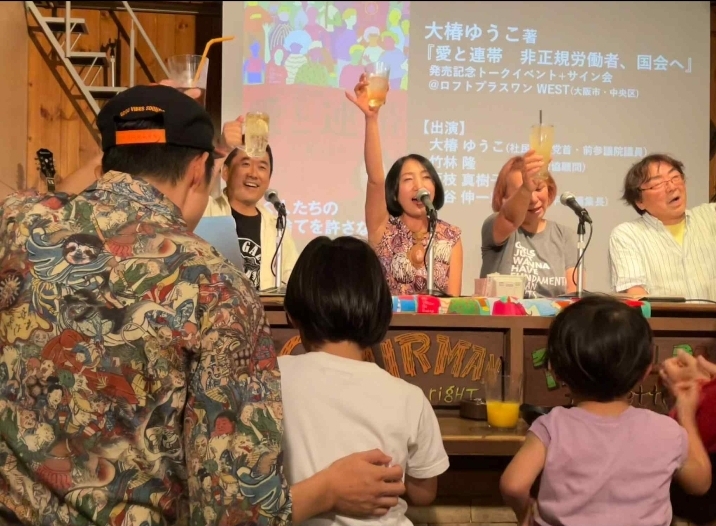 7月初旬に出版された、大椿ゆうこ副党首の初めての著作『愛と連帯 非正規労働者、国会へ』の発売記念トークイベントとサイン会が8月30日、大阪市内にあるライブハウス・ロフトプラスワンウエストで開催され、50人以上が参加した。主催は、出版元の地平社。参加者は、お酒と食事を楽しみながら、政治家・大椿ゆうこの誕生にまつわる、さまざまなエピソードに耳を傾けた。