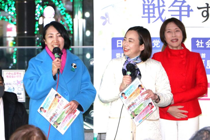 衆院解散の表明を受け、福島みずほ社民党党首・田村智子日本共産党委員長・岡﨑ひろみ新社会党委員長などが1月21日夕、東京・JR有楽町駅前で、寒空のもとで共同街頭宣伝を行なった。社民党の大椿ゆうこ副党首と共産党の吉良よし子参院議員が共同司会を務めた。聴衆は約550人に上った。同メンバーらによる共同街宣は、昨年12月26日に続いて2度目。
