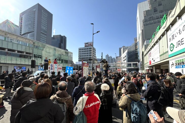 衆院選候補らの第一声を聞く市民たち。(1月27日、新宿駅南口前)